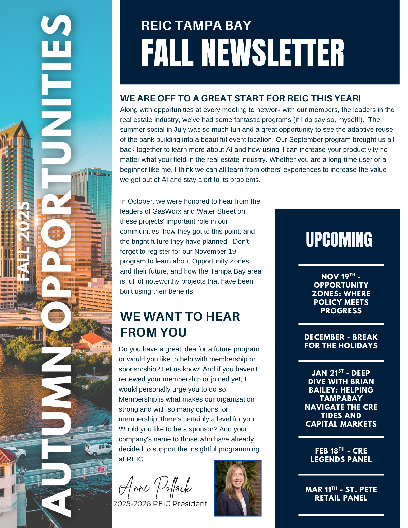Benefits of MembershipBecome a member of REIC Tampa Bay and unlock a world of opportunities! Network with fellow commercial real estate professionals, stay updated with the latest industry news, and access a wealth of resources to help you thrive. Our membership dues are $125 for Young Professionals (under 35 years old), $275 for individuals and $650 for companies (includes up to 4 representatives, with only $100 for each additional member). Enjoy all the benefits of membership for a full year from the date of your application. Join us and elevate your professional journey! Join TodayYoung Professionals GroupThe Real Estate Investment Council (REIC) has made a concerted effort over the past 12 years of cultivating our Young Professional members, those specifically under the age of 35. This exclusive group grants unmatched access to high-profile industry leaders, offering young professionals exceptional networking and mentorship opportunities to fast-track their careers. Join us and connect with the top talent in the industry! Continue Reading |