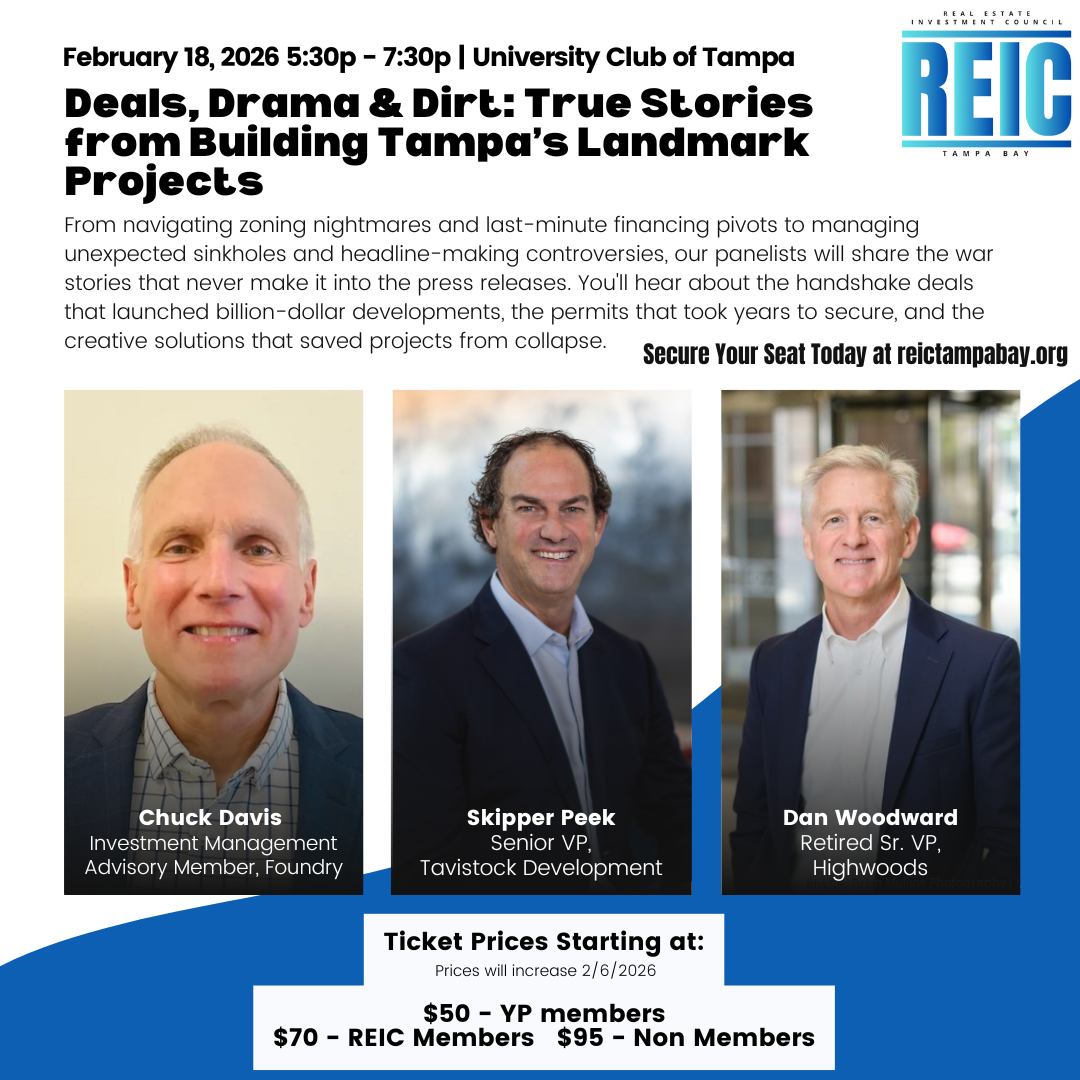 Ever wonder what really goes into transforming Tampa's skyline and the Cyclical Timing & Challenges that faced many Developers, Lenders, Joint Venture Partners. Join us for an unfiltered evening with the Developers, Lenders, Brokers, and builders who've shaped our city's most iconic commercial projects. From navigating zoning nightmares and last-minute financing pivots to managing unexpected sinkholes and headline-making controversies, our panelists will share the war stories that never make it into the press releases. You'll hear about the handshake deals that launched billion-dollar developments, the permits that took years to secure, and the creative solutions that saved projects from collapse. Whether you're a real estate professional, aspiring developer, investor, or simply fascinated by how cities grow, this candid conversation offers a rare behind-the-scenes look at the grit, negotiation, and occasional chaos that goes into creating Tampa's commercial landmarks. What You'll Gain: